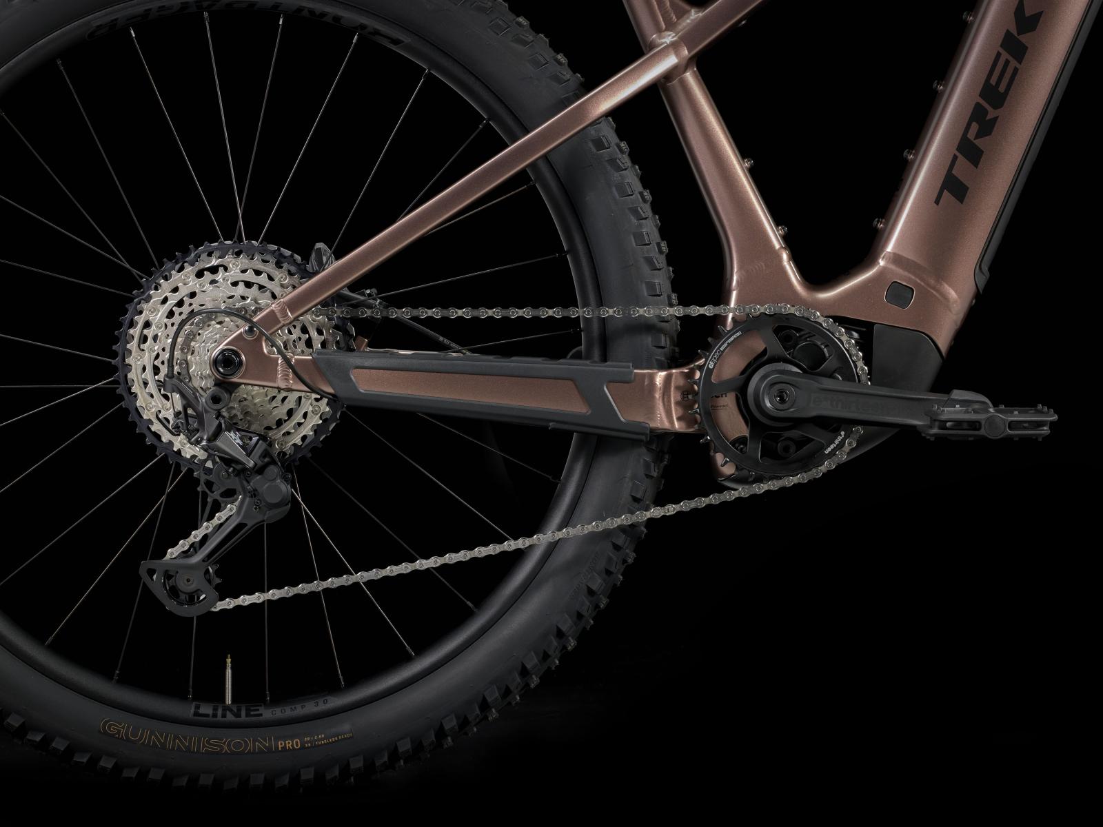 Einen Hardtail-Rahmen aus Alpha Platinum Aluminium mit FOX Float AWL Gabel mit Luftfederung und RAIL 2.0 Dämpfung. Einen leistungsstarken Bosch Performance Line CX Motor mit 250 W Leistung und 85 Nm Drehmoment samt abnehmbarem, integriertem PowerTube RIB 2.0 Akku mit mächtigen 800 Wh Kapazität und Purion 200 Controller. Eine 12-Gang-Schaltung mit einem Mix aus Shimano SLX/XT Komponenten, Tubeless-Ready-Laufräder von Bontrager, eine Bontrager Line Variosattelstütze, hydraulische 4-Kolben-Scheibenbremsen von Shimano und zahlreiche Befestigungsmöglichkeiten für Taschen und Gepäckträger.