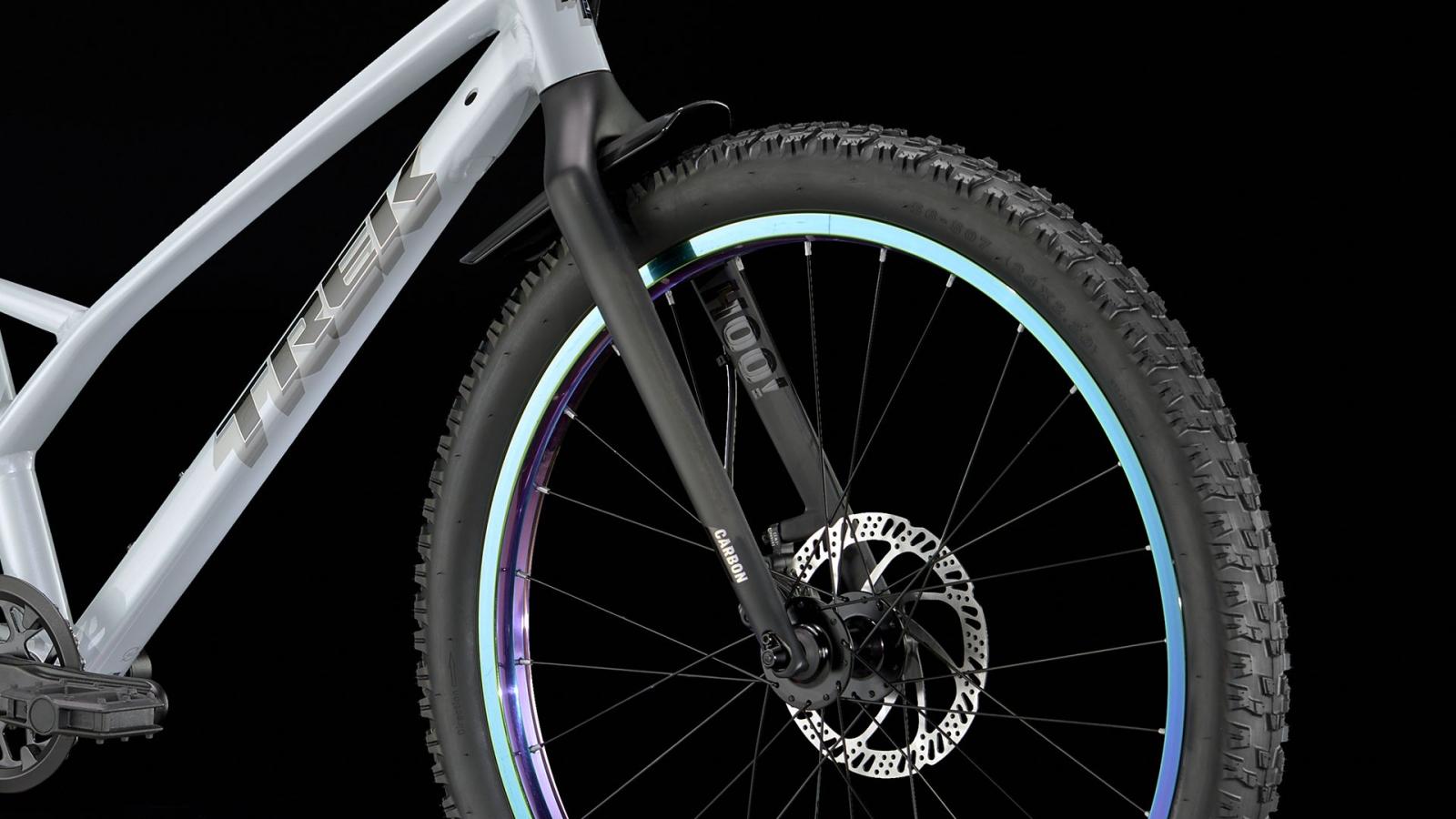 Einen Rahmen aus Alpha Silver Aluminium mit 20 Zoll großen Laufrädern und griffigen, 2,4 Zoll breiten Stollenreifen, die sich im Untergrund festbeißen und ein Plus an Traktion bieten. Dazu gibt es eine speziell auf Kinderbedürfnisse zugeschnittene Ausstattung, wie etwa die intuitive 9-Gang-Schaltung von microSHIFT und die kraftvoll zupackenden hydraulischen Scheibenbremsen.