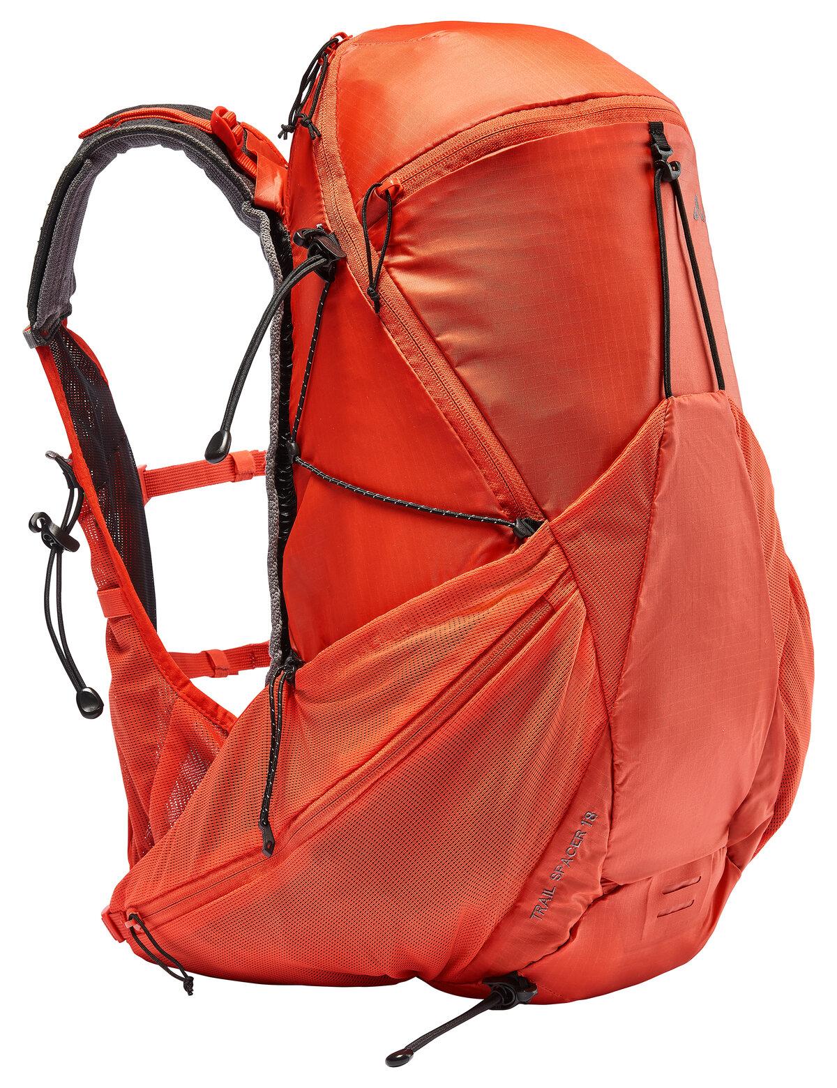 Ein perfekter Begleiter für lange, schnelle Touren: Dieser leichte Multisport-Rucksack bietet durch das 3D-formgestrickte Rückenteil maximalen Komfort, perfekten Halt und mit 18 Litern Volumen viel Platz für Speed Hiker, Mountainbiker, Langläufer und sportliche Wanderer. Die aus umweltfreundlich recyceltem Garn hergestellte 3D-Strickkonstruktion ist weltweit einzigartig: Damit werden unterschiedliche Druckzonen im Rückenbereich berücksichtigt und eine homogene Druckverteilung und Belüftung erreicht. Der Trail Spacer 18 verfügt über eine Trinkblasenvorrichtung und Stauraum für eine Tagestour. Die Schulterträger bieten Fächer mit Platz für Gels, Riegel, Handy u.a. Zwei seitliche Stretchtaschen an dem leichten Rucksack bieten weiteren Stauraum. In der Fronttasche kann eine nasse Regenjacke und das Erste Hilfe Set verstaut werden. Stockhalterung und Kompressionsriemen sind auch bei aufgesetztem Rucksack bedienbar. Für das recycelte Hauptmaterial Polyamid werden über ein zertifiziertes Massenbilanzverfahren unter anderem Altreifen verwendet. Dadurch werden bis zu 60 % CO2 eingespart. Da das Rückensystem auf Form gestrickt wird, fallen bei der Produktion keine Abfallreste an. Das VAUDE Green Shape-Label steht für ein umweltfreundliches, funktionelles Produkt aus nachhaltigen und bluesign® zertifizierten Materialien. Tipp: Rucksack immer von Hand waschen.